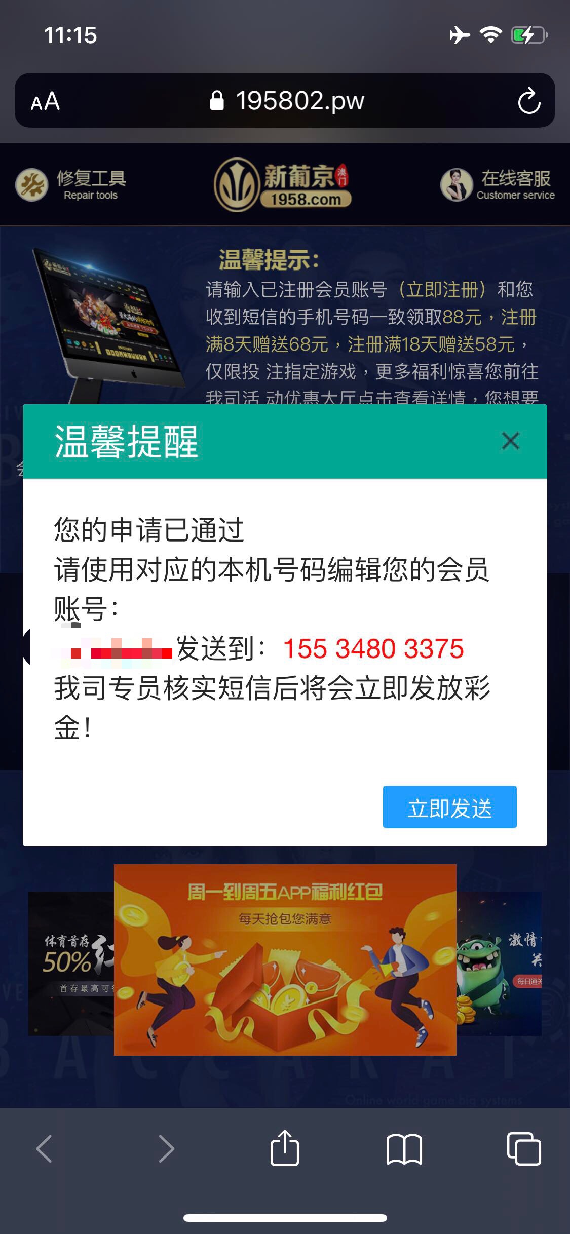 我点申请点的太快了有个页面应该是叫发短信的页面没看见就过去了再点就显示已领取兄弟们点慢点 然后他们的收短信手机号可以发一下吗