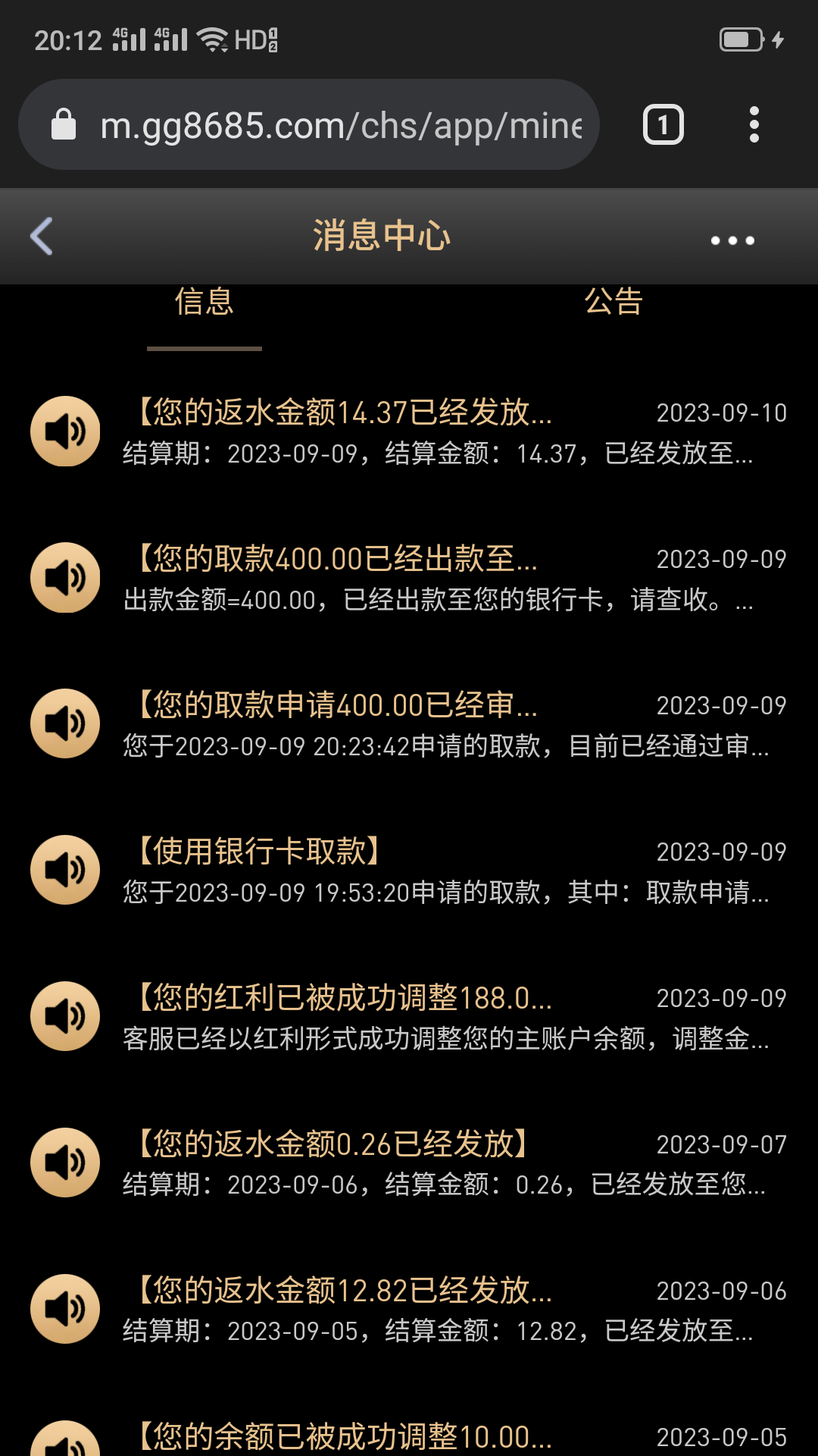 乐博这个台子一毛没充值过,送了3次彩金,第一次88第二次118第三次188,这个月4号打电话过来说有彩金,去找客服申请给我上了188又扣掉80又加上去10元,那就是118,昨天来电话又说有彩金登录上去有188打出来400提现到账了。可以碰瓷的我另外的号没电话直接去找客服也送了118。网址https://m.gg8685.com/
