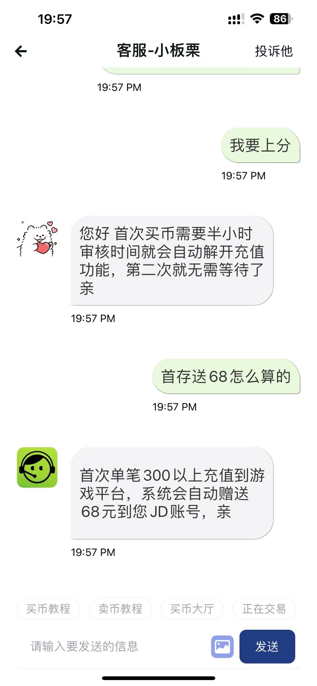 上面那个大哥,人家的意思是买300充值到台子里面送68币,你他妈只有200,还有新人30分钟才能用,所以很正常,笨求货