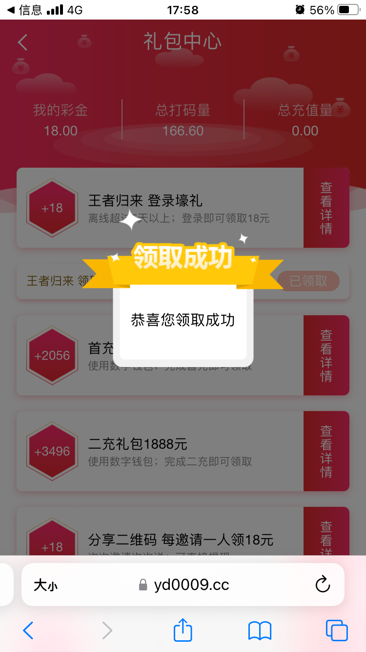 【云顶娱乐7305】回归老用户离线5天以上登录领18.之前领取过注册18的都上号看看。 亲测没充值也能领到,具体自测每个人情况都不一样。 彩金限制自行查看 https://ydylp.cn/