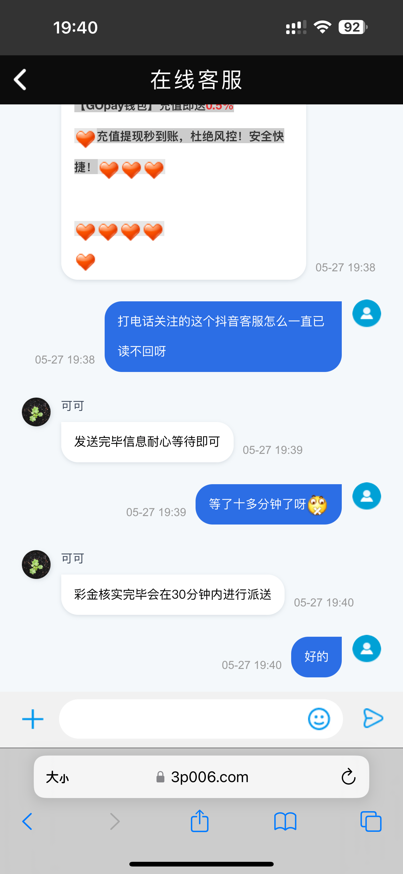 老用户有账号的去 跟客服说领取电话彩金 发电话号码给她然后她就给抖音号给你关注再发电话名字账号给抖音这个人 不知道是不是统一这个抖音aa2000162636 你们也可以直接关注然后私信试一下 发了之后30分钟内到 抖音不回复的 但还是最好找客服问一下发抖音再去吧 反正碰瓷有就有 没有就没有 狗叫也没用 网址3p006.com