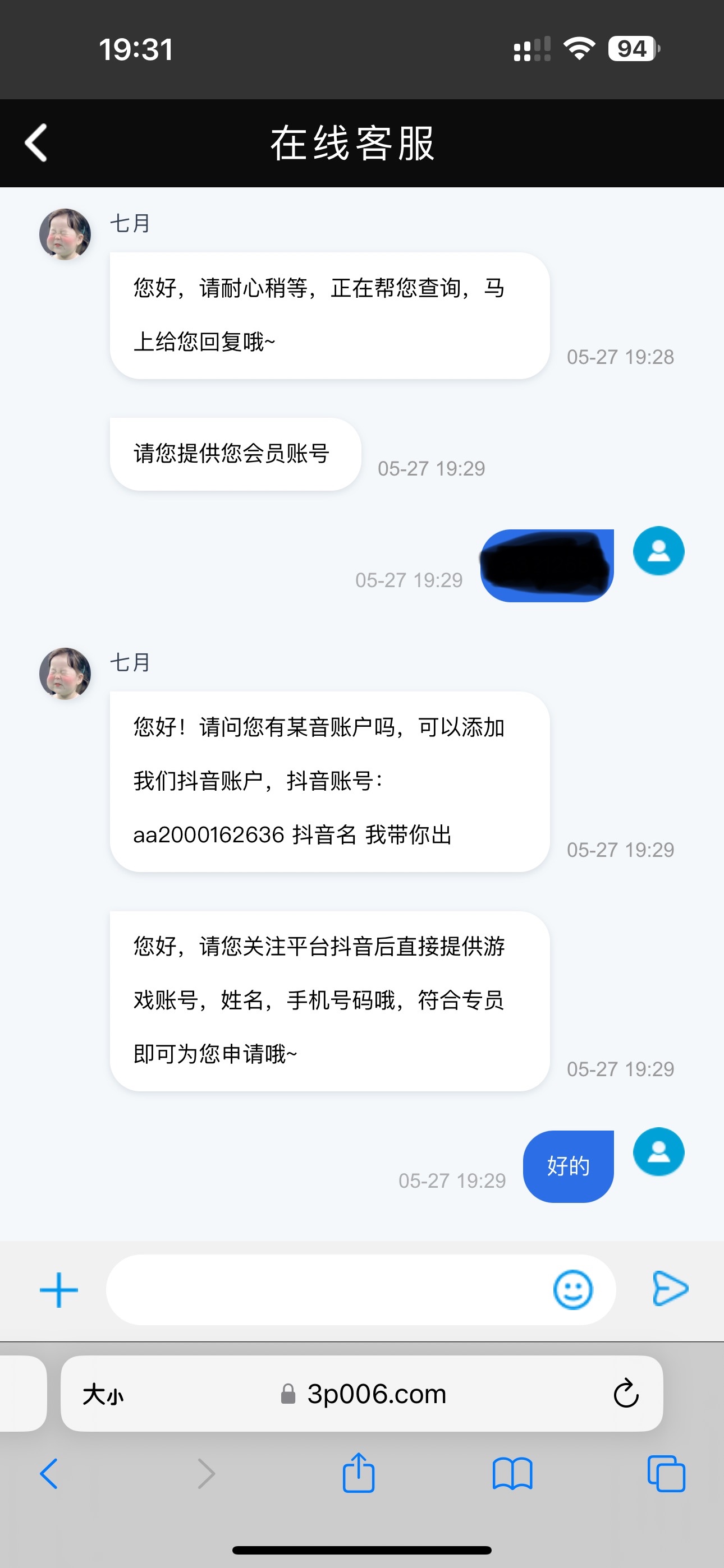 直接加的抖音,充值过300