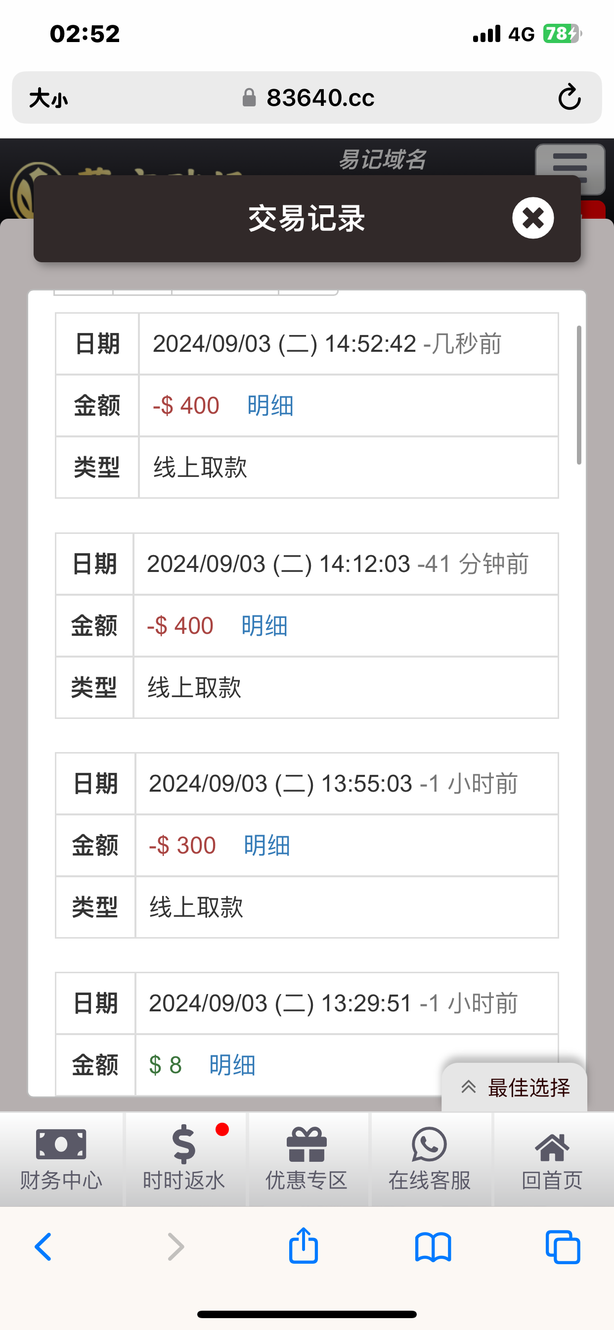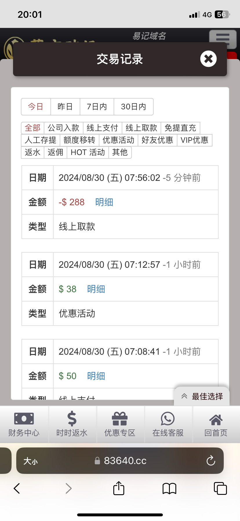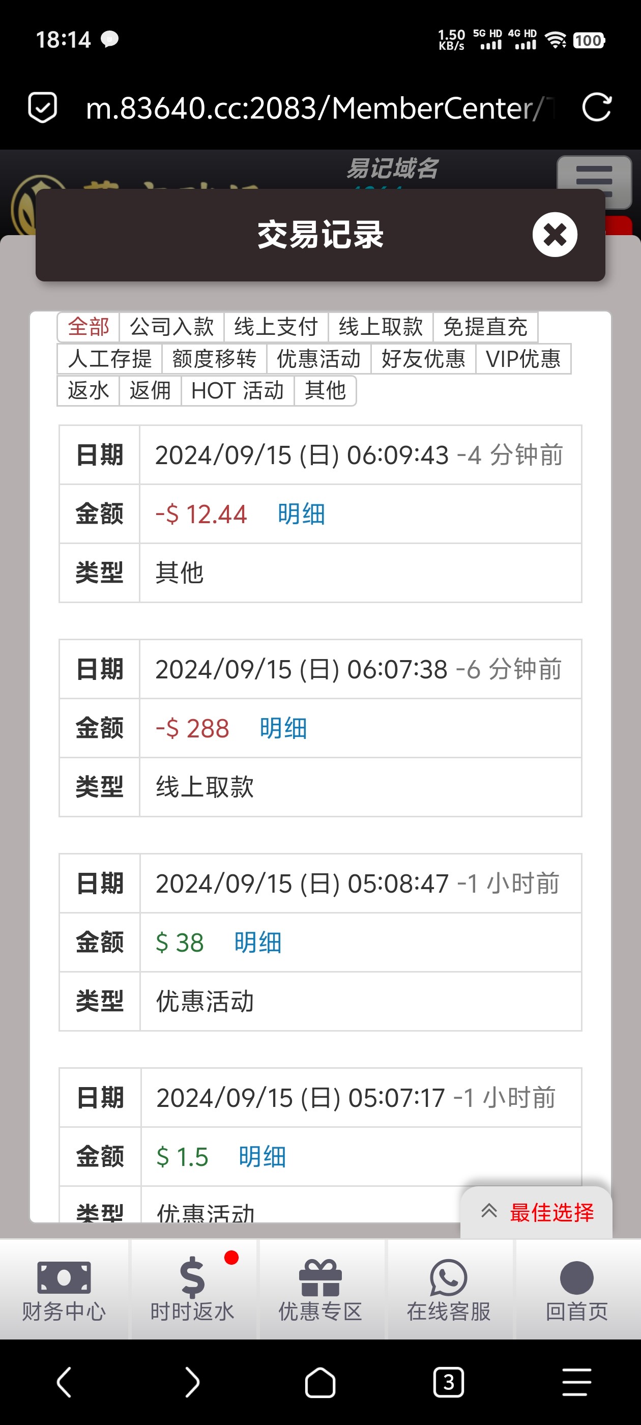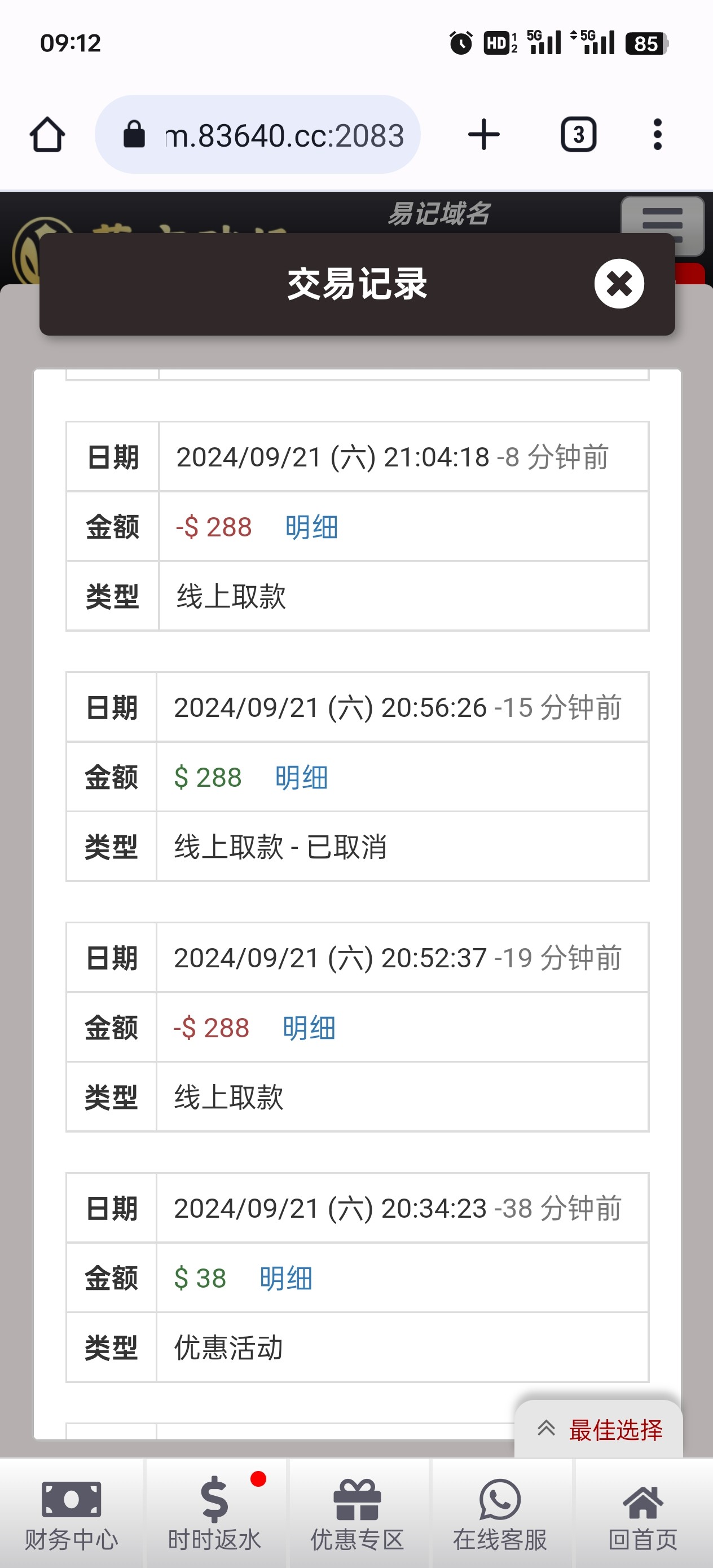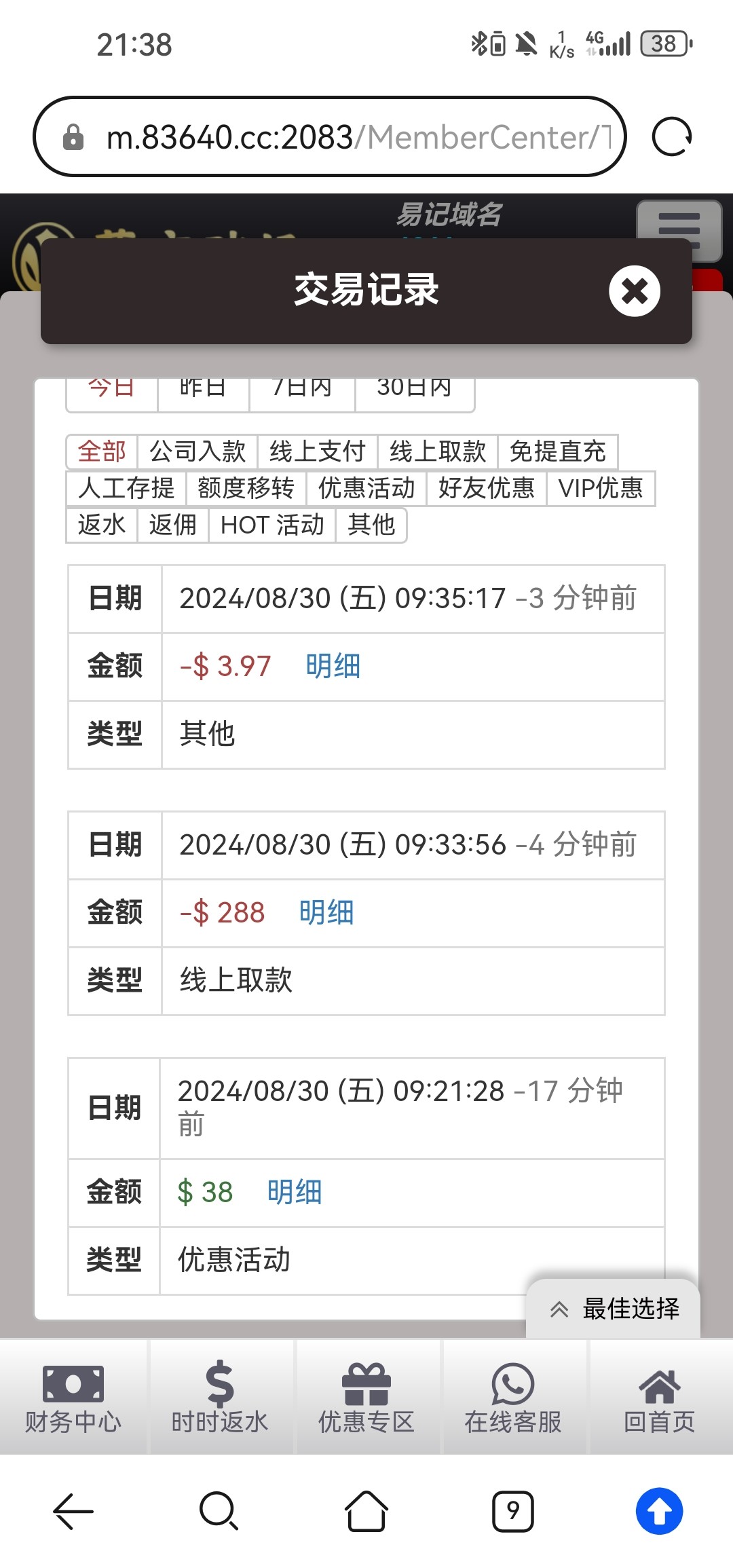 4064以小博大50+38 满288就可出。以前是要888,现在改了然后可以每天一次。有实力老哥上吧。这台子就玩过两次以小博大,然后今天出一次 黑不黑老哥们自己把握。还有那个绑定钱包送8的活动 两次博大累计满100就可以申请了。网址就数字+.com