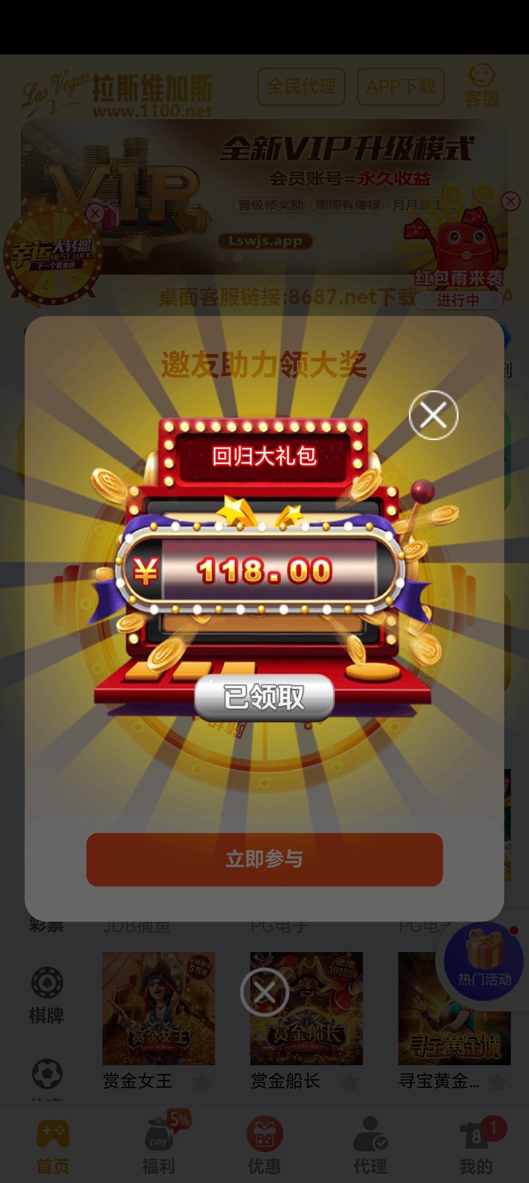 老用户登录看看有没有回馈彩金,有的直接回馈118彩金,好像充值过的才有,具体自测吧。