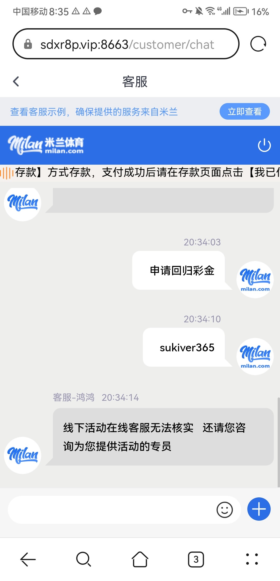 有账号的去 找在线客服说回归彩金 或者发图给客服 我领了158没打出来 链接milan.com