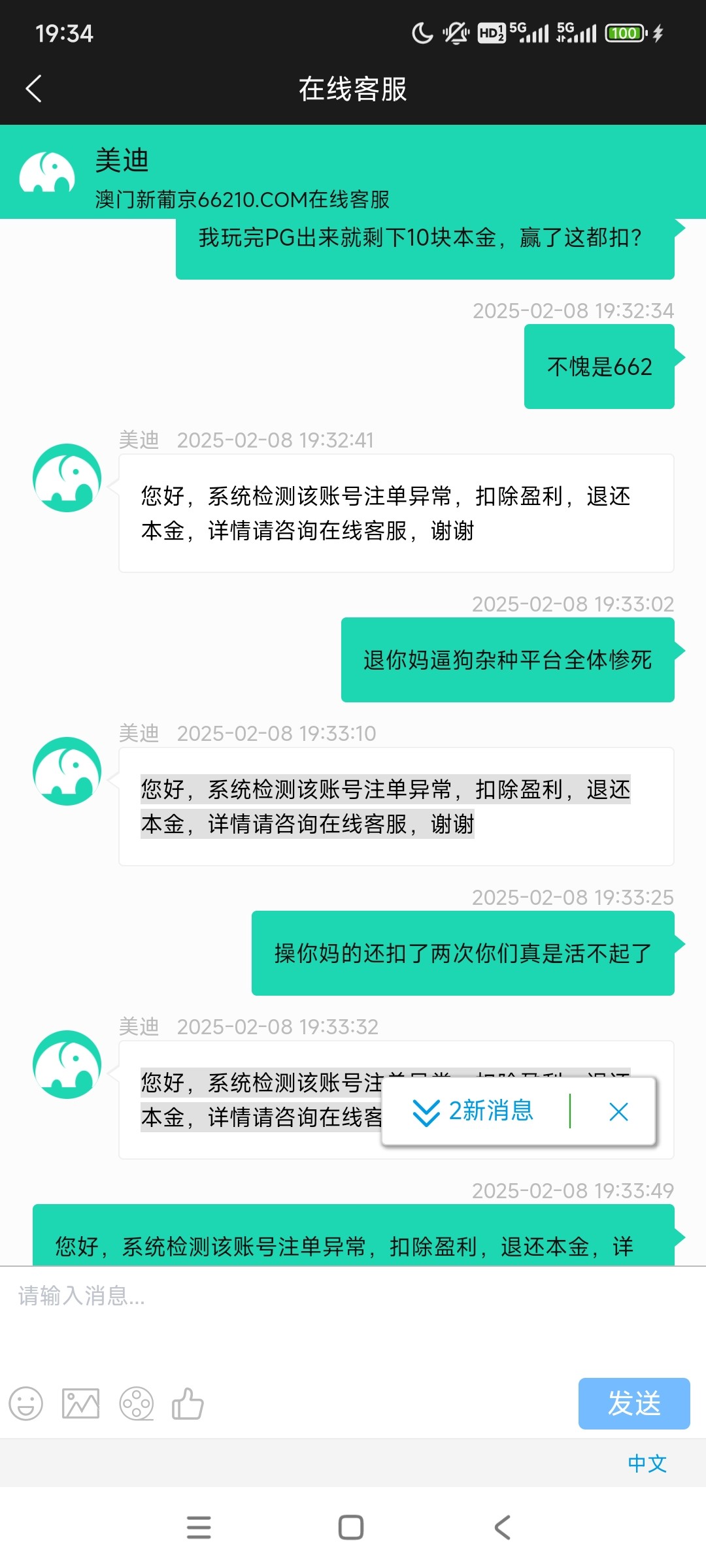 有个几个月没玩的号上去看到钱能还有10,充了去打PG赢了几块然后进AG街机,出来提100,然后扣掉,说套利彩金,我他妈都没领过彩金就直接是本金进游戏的,退回来10块之后我又进动物狂欢直接单压红狮子赢了500,提了又扣了,这次直接说注单异常,我一直以为662不会充值黑,真没想到啊这出生台搞这出