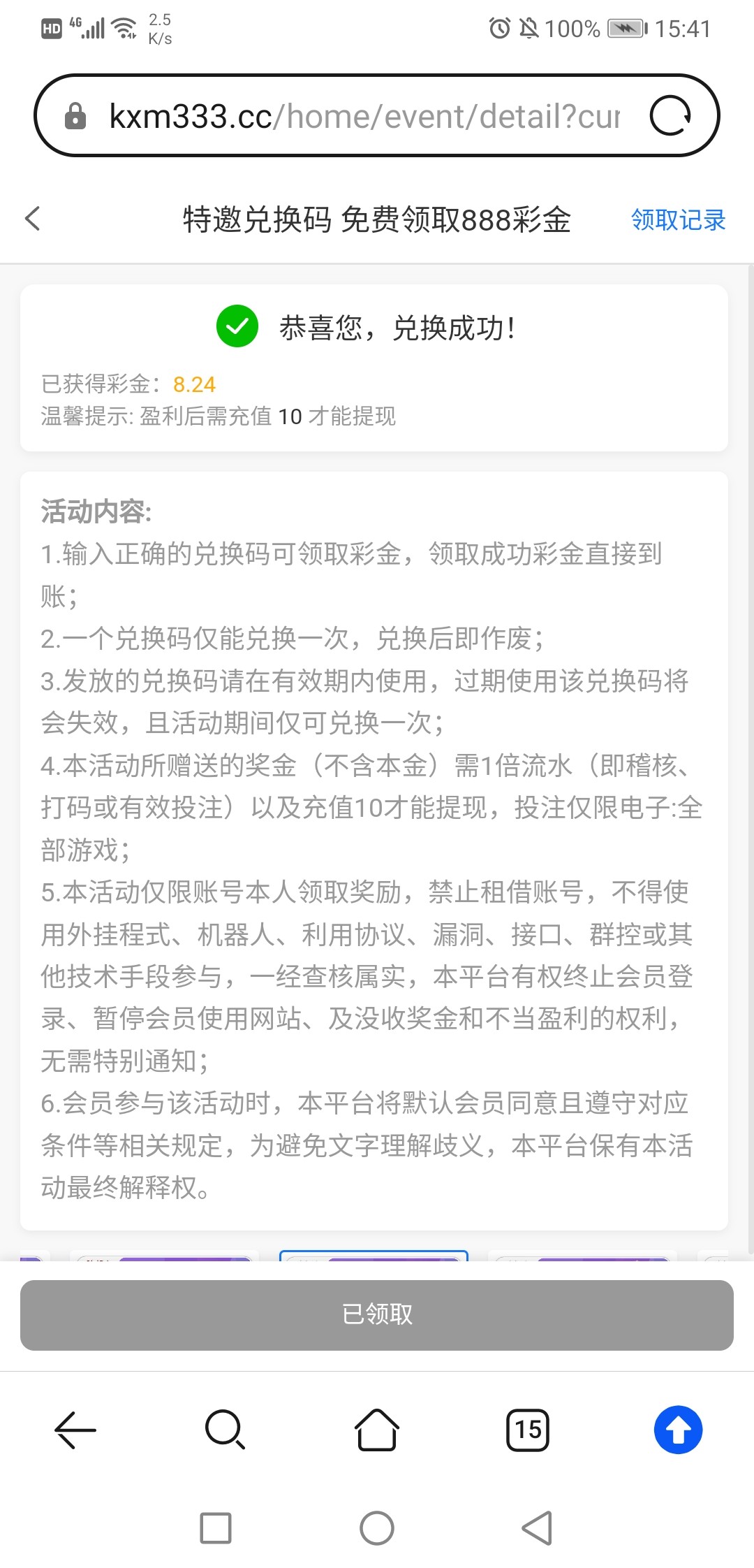 新用户注册绑定信息去论坛商场自助领取兑换码彩金(限制电子游戏),一码一号多号必封号,出款要充值10块钱具体看活动规则