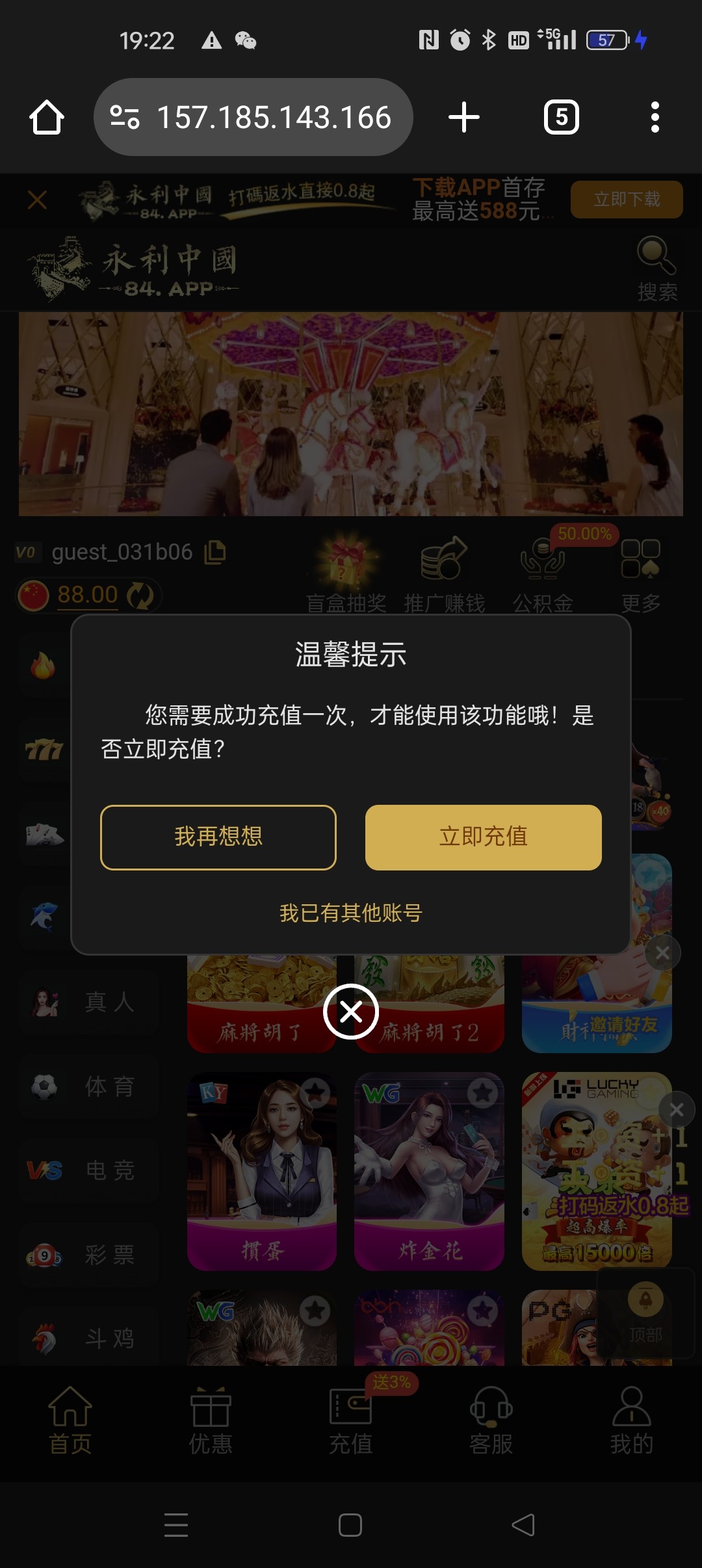傻逼玩意有88要冲才能玩 上次有一个特邀也是送38要冲才能玩现在的狗庄送不起就别送 送了又骗人冲值