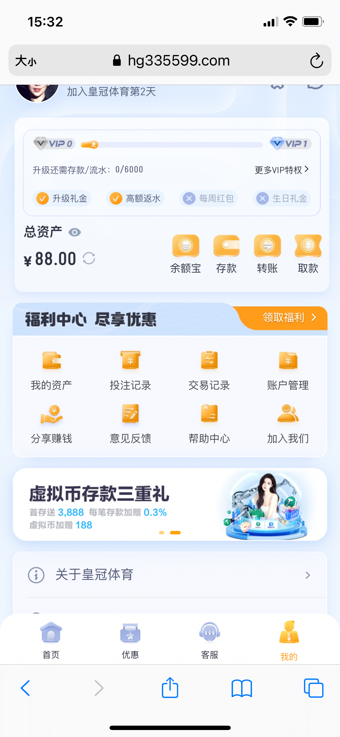 昨天有个帖子 58彩金的 我直接注册 第二天直接去找客服电话彩金  报了电话过去 对面还真的打个电话过来问我是不是领取电话彩金的 我说是  然后就到账了  出款就不知道能不能出了   https://www.hg335599.com:30050/app/home