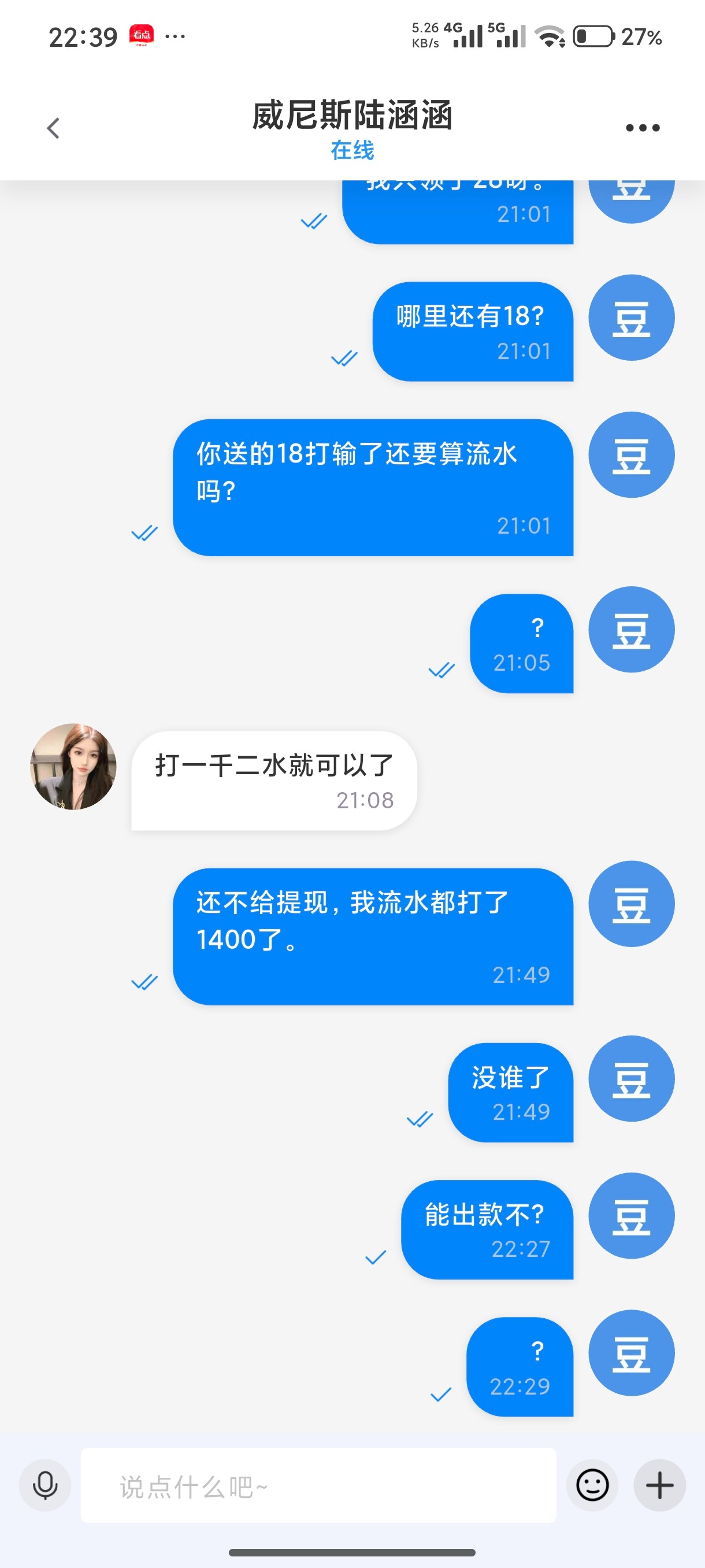 100+28让打1200的流水。打够了提现就一直说注单异常,这种情况想都不用想了必黑。找个借口不让提现,狗东西已读不回。